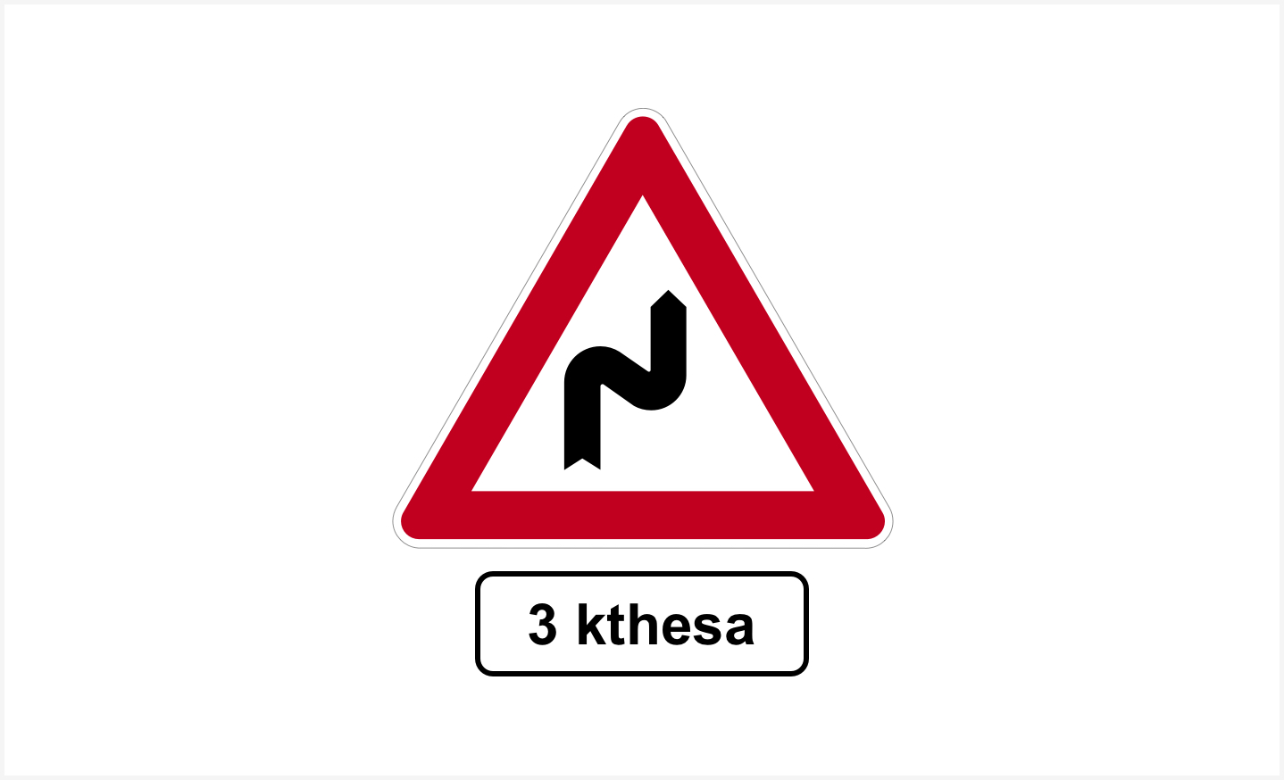 Sinjali i shoqëruar me panelin plotësues, si në figurë, paralajmëron 3 (tre) kthesa të rrezikshme, prej të cilave e para është djathtas.